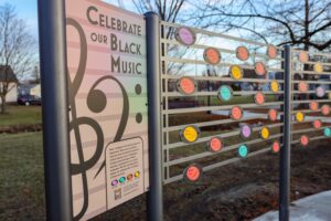 Its centerpiece is a sculpture by African American artist Preston Jackson that is designed to reflect a variety of musical instruments and genres of significance to local Black musicians. The sculpture is surrounded by a small plaza, lighting, a seating wall, and a sloped berm. Pathways invite residents and visitors to enter the park where they can play with interactive musical instruments and view bricks that were donated and inscribed by numerous community members to support the park’s development. A “Wall of Fame” sign that acknowledges specific African American musicians is planned for late 2024.